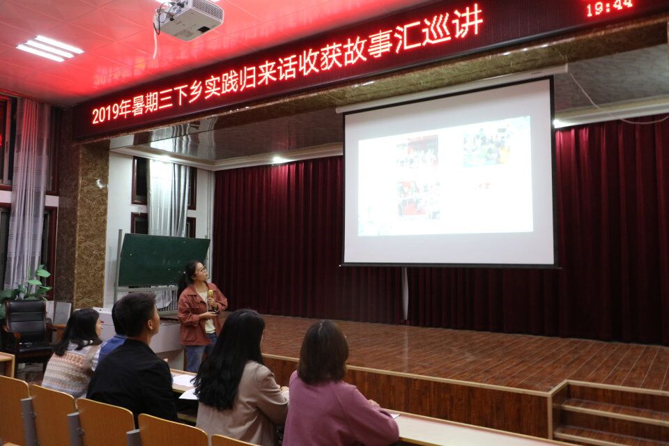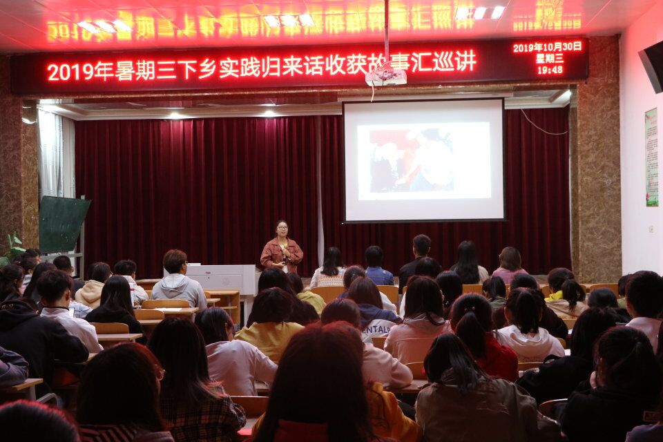 为进一步宣传展示实践成果,深入了解社会实践活动,由beats365中文官网校团委主办的"2019年暑期三下乡实践归来话收获故事汇巡讲" 活动于10月30日晚在睢阳区生物报告厅圆满举行。本次故事汇巡讲活动共有19个团队参加。