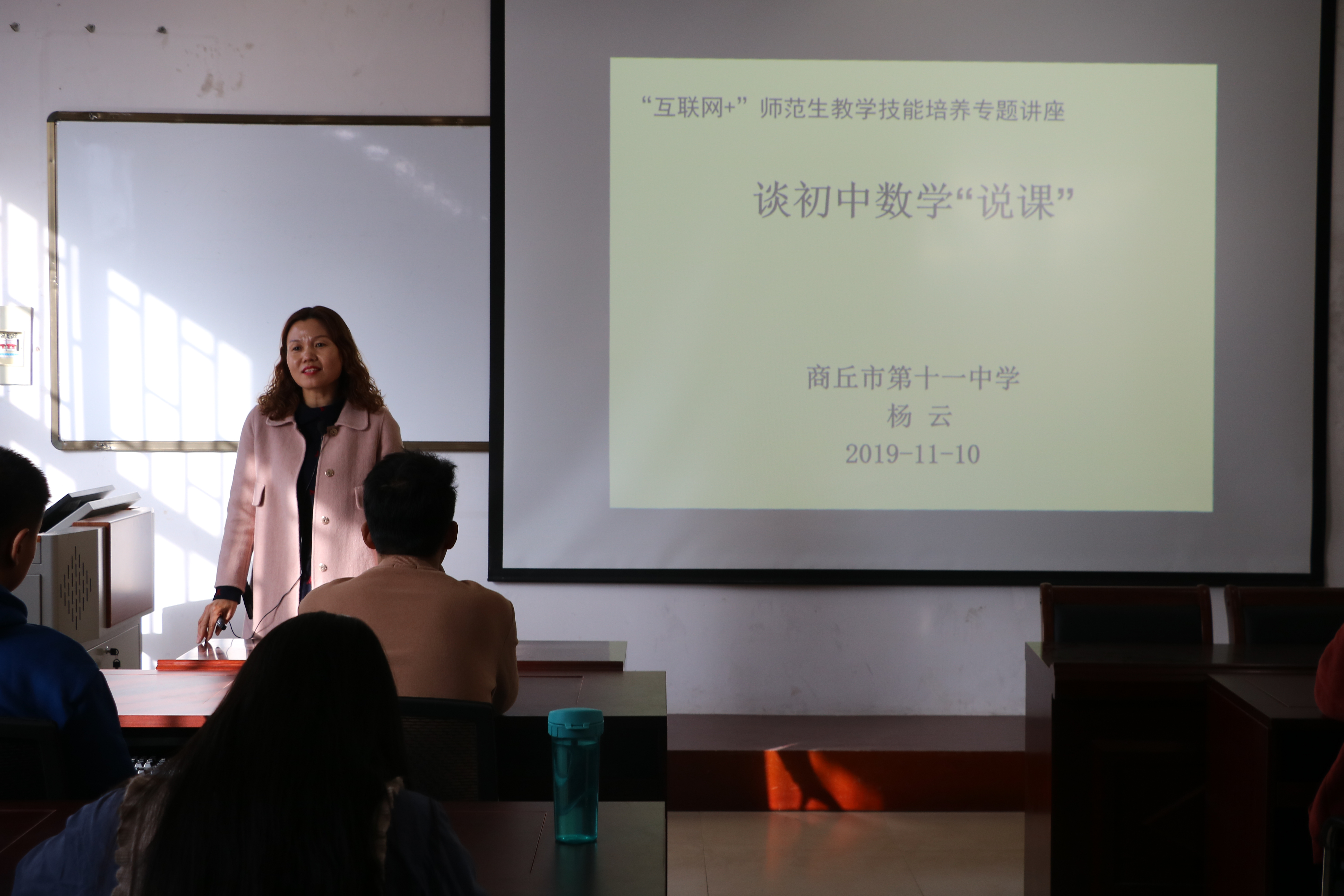 为切实提高师范生的说课能力,11月10日上午九点beats365中文官网“互联网+师范生技能培养”专题讲座之谈初中数学“说课”在睢阳校区办公楼二楼208教室举行。本次活动由beats365中文官网副经理张斐然,工作坊负责人姜素华、黄丽芝老师及商丘市实验中学刘菲老师出席,全体坊员参加。讲座由商丘市第十一中学教学名师杨云老师主讲。