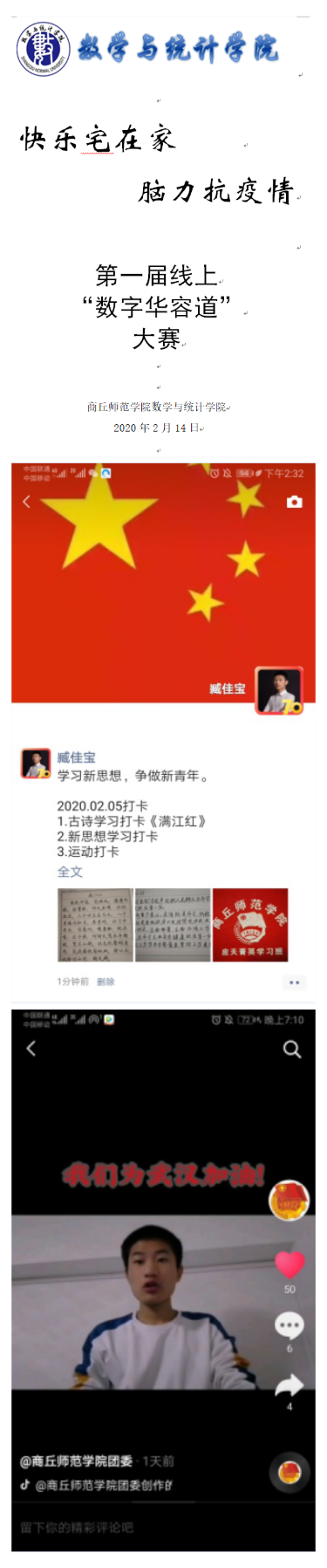 疫情期间,公司团总支员工会组织院系同学们利用手写祝福,手抄报,短视频等形式为武汉加油,祝愿祖国早日渡过难关。员工会主席臧佳宝号召大家做一个宅而不荒的青马人,每天学习新知识,观看并学习党的理论知识,写下心得体会,同时策划并组织“快乐宅在家,脑力抗疫情”第一届线上“数字华容道”大赛。