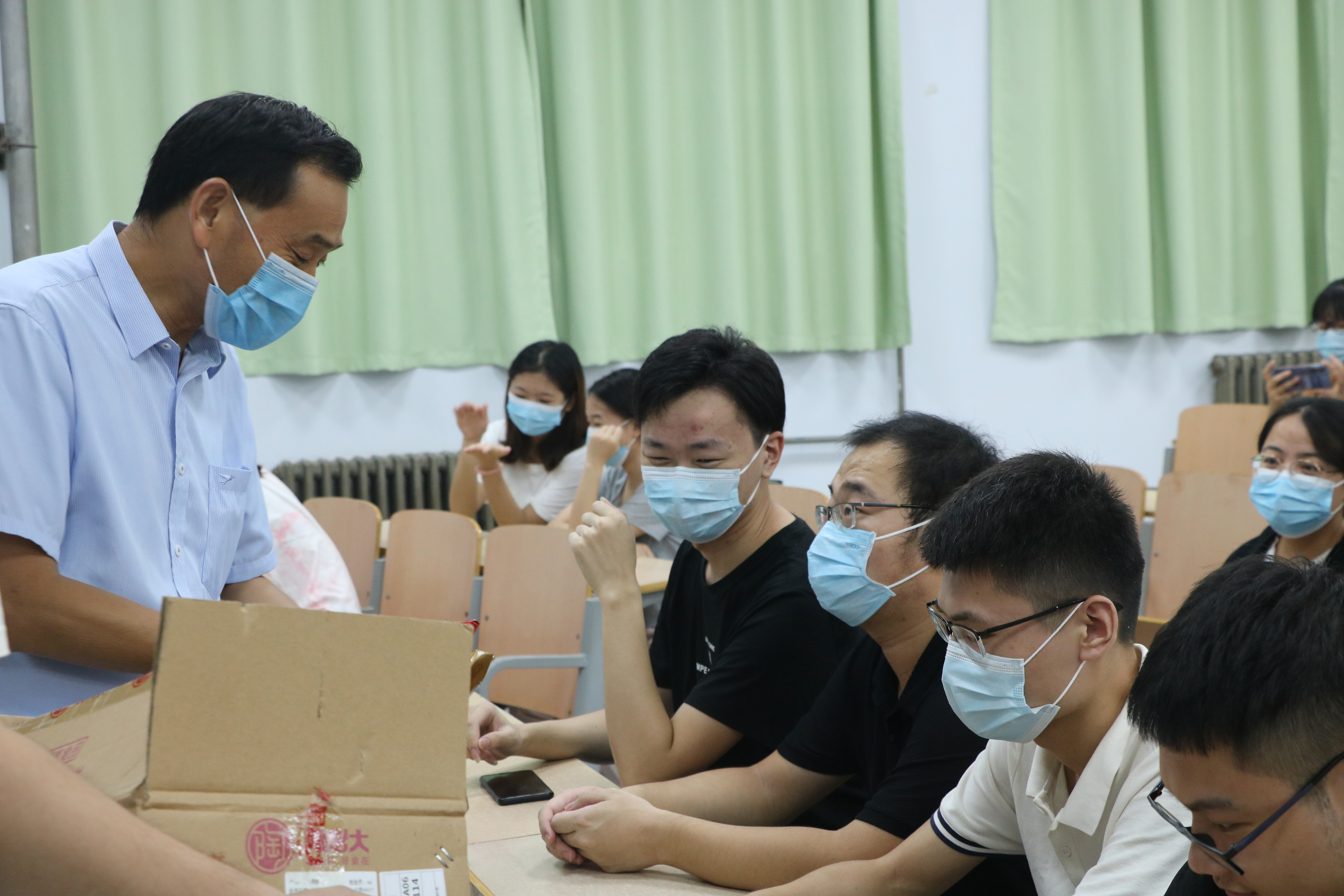 在中秋国庆双节来临之际,为营造祥和愉悦的节日氛围,让留校员工在公司欢度佳节、感受家的温暖。2021年9月18日下午6点,公司党委书记孟学超,经理张斐然,党委副书记陈树艳,副经理刘磊,团总支书记姜素华及18级辅导员李昊阳前往教学楼108教室为留校员工送去月饼和节日祝福。