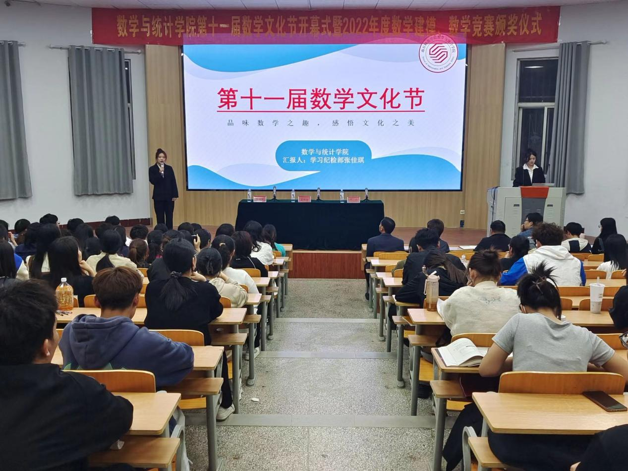 本次活动包括开幕式和颁奖仪式两个环节。开幕式上,党委书记孟学超首先对本次数学文化节致开幕词。接下来大屏幕上展播了往届数学文化节活动视频材料,由学习纪检部张佳琪同学对本届活动的内容等进行了详细介绍。伴随着热烈的掌声,孟书记宣布本届数学文化节正式启动!