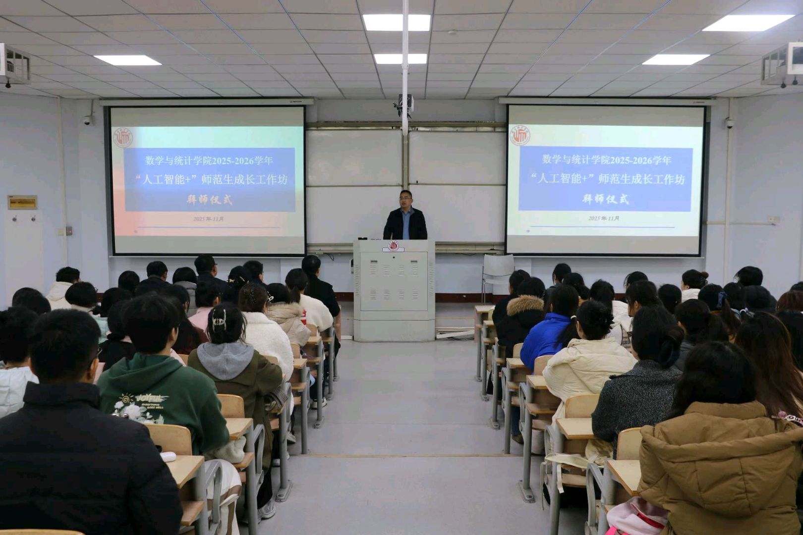 为促进数学与应用数学师范生教学技能培养工作的改革与发展,助力同学们锤炼教学技能,2025年11月25日下午,beats365中文官网在睢阳校区1号教学楼207教室举行了2025-2026学年“人工智能+”师范生成长工作坊拜师仪式。beats365中文官网副经理任磊、数学与应用数学系主任司红颖、辅导员王迎春以及6位校外一线名师参加了此次启动仪式。仪式由任磊副经理主持。