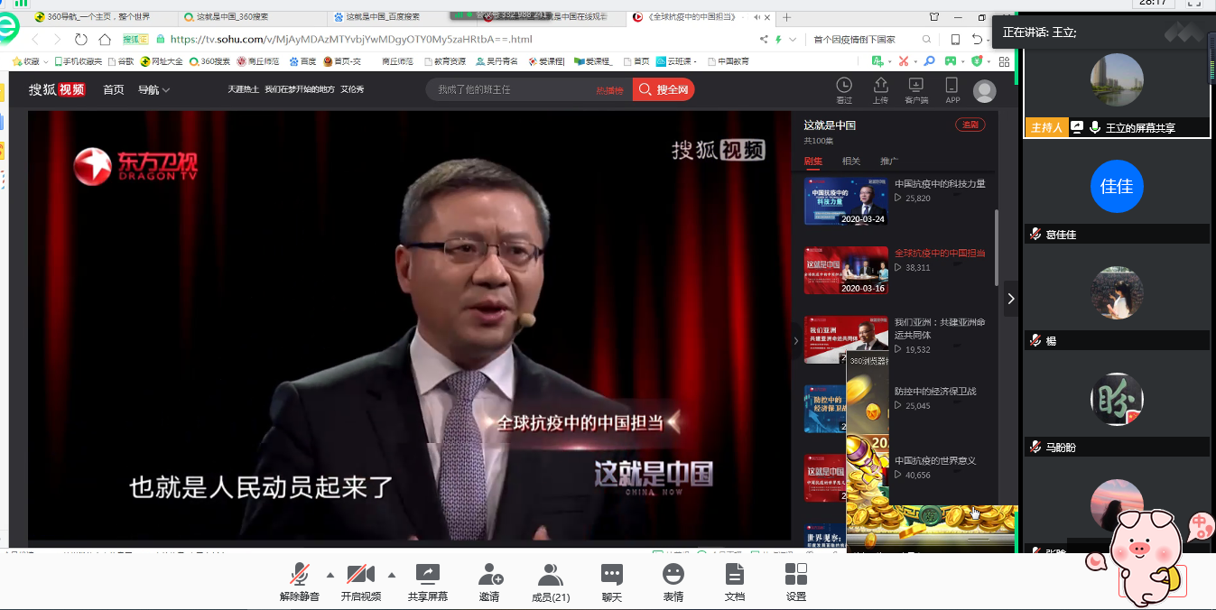 随后,全体党员一同观看了复旦大学中国研究院经理张维为《这就是中国》中的《全球抗疫中中国的担当》。这次的新冠肺炎疫情让更多人清楚地意识到,病毒面前没有国界,面对疫情,任何一个国家都难以独善其身。在疫情防控过程中,我们更进一步体会到中国共产党的集中统一领导和中国特色社会主义制度的优越性,感受共产党员在疫情防控战役中的模范带头作用,通过疫情期间发生的一个个案例,让员工党员们看到中国共产党带领的中国人民在战“疫”中所展现出的中国速度、中国效率、中国力量、中国精神。
