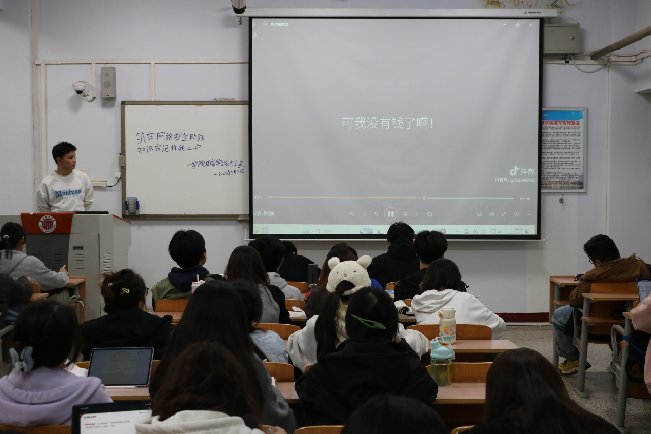 活动伊始,员工以班级为单位观看了安全防范教育视频,学习了网络安全专家对网络诈骗、信息泄露、恶意软件等常见网络风险的解读,以及相应的防护措施。教育视频通过真实生动的案例和深入浅出的讲解,将原本复杂的安全知识以直观的方式呈现给同学们。随后,设置了安全知识问答环节,同学们踊跃参与。此外,各班还邀请了几位同学上台分享自己的故事和应对经验,以亲身经历警示大家安全防范的重要性。