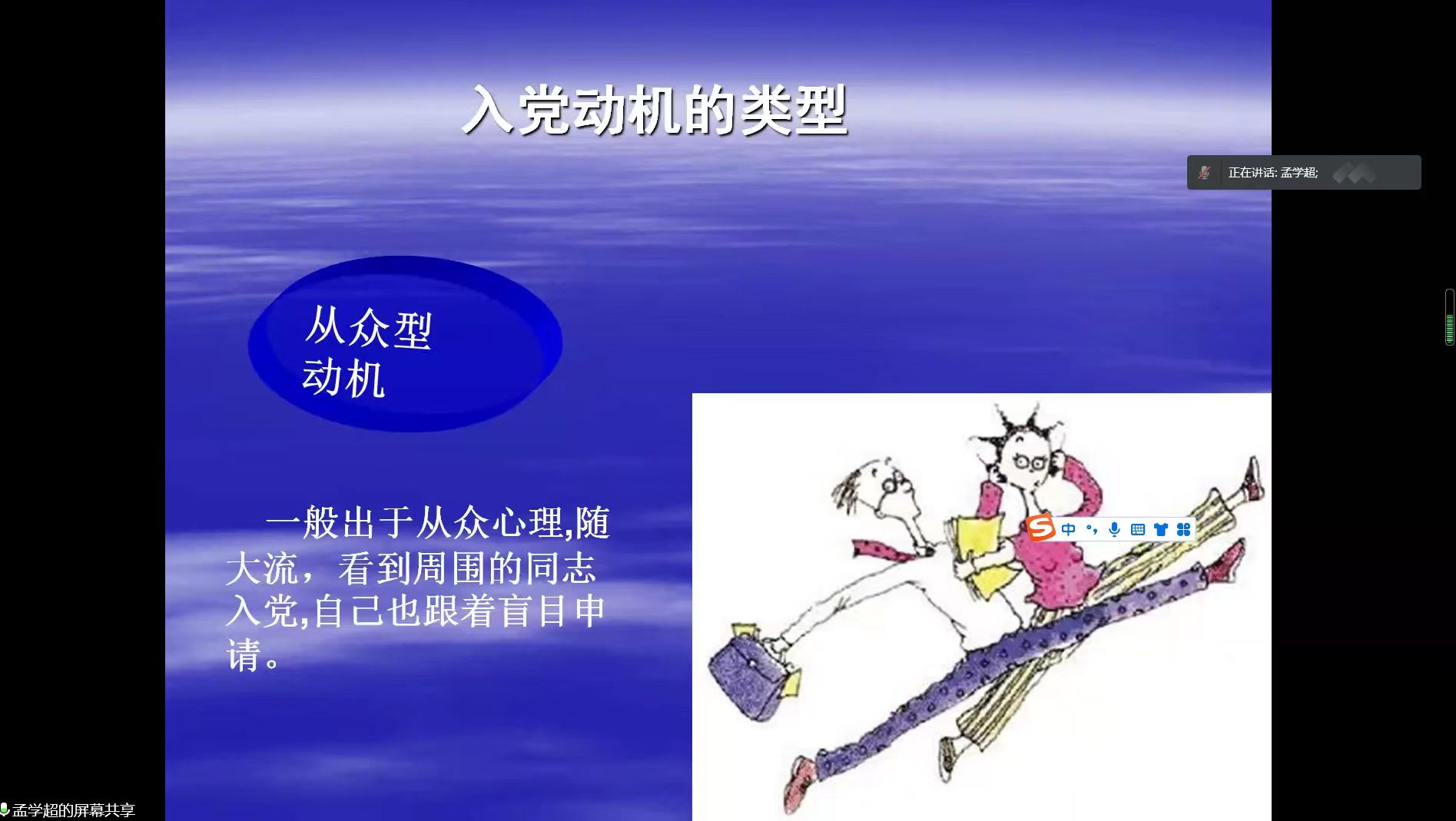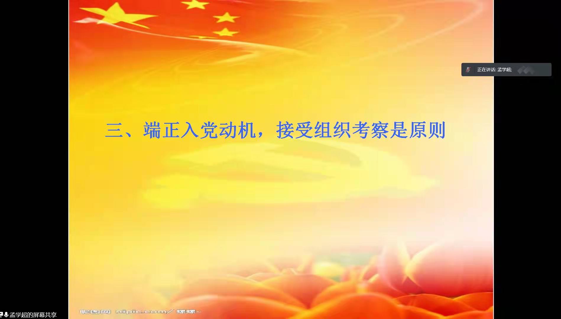 为端正入党积极分子的入党动机,beats365中文官网于3月28日晚线上召开了以“端正入党动机,争取早日加入党组织”为主题的中级入党积极分子党课培训会议。本次党课由党委书记孟学超主讲,全体中级入党积极分子参加。