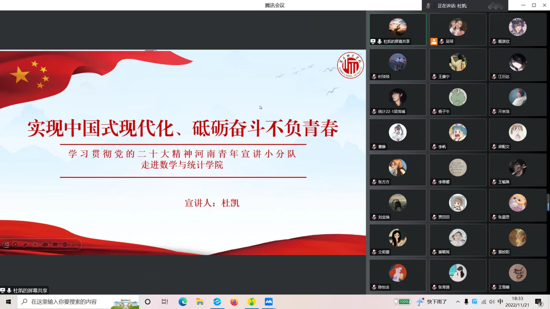 宣讲会上,杜凯以“实现中国式现代化、砥砺奋斗不负青春”为主题突出了对“党的二十大的主题和主要成果、中国式现代化的本质要求和特征、深刻认识新时代十年的伟大变革、不牢牢把握新时代新征程中国共产党的使命任务”等内容的阐释,结合自己参与脱贫攻坚亲身感悟和其他典型事例激励大家作为新时代中国青年要把基层作为最好的课堂,把实践作为最好的老师,将个人奋斗的“小目标”融入党和国家事业的“大蓝图”,将自己对中国梦的追求化作一件件身边实事,在磨砺中长才干、壮筋骨。