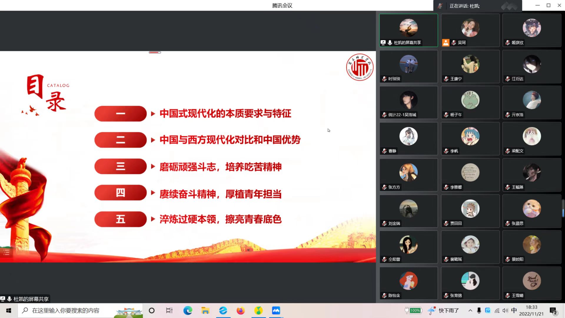 杜凯最后总结,全体师生要高举中国特色社会主义伟大旗帜,全面贯彻习近平新时代中国特色社会主义思想,坚定信心、同心同德,埋头苦干、奋勇前进,为推进中国式现代化奉献青年力量,更为全面建设社会主义现代化国家、全面推进中华民族伟大复兴而不懈奋斗。