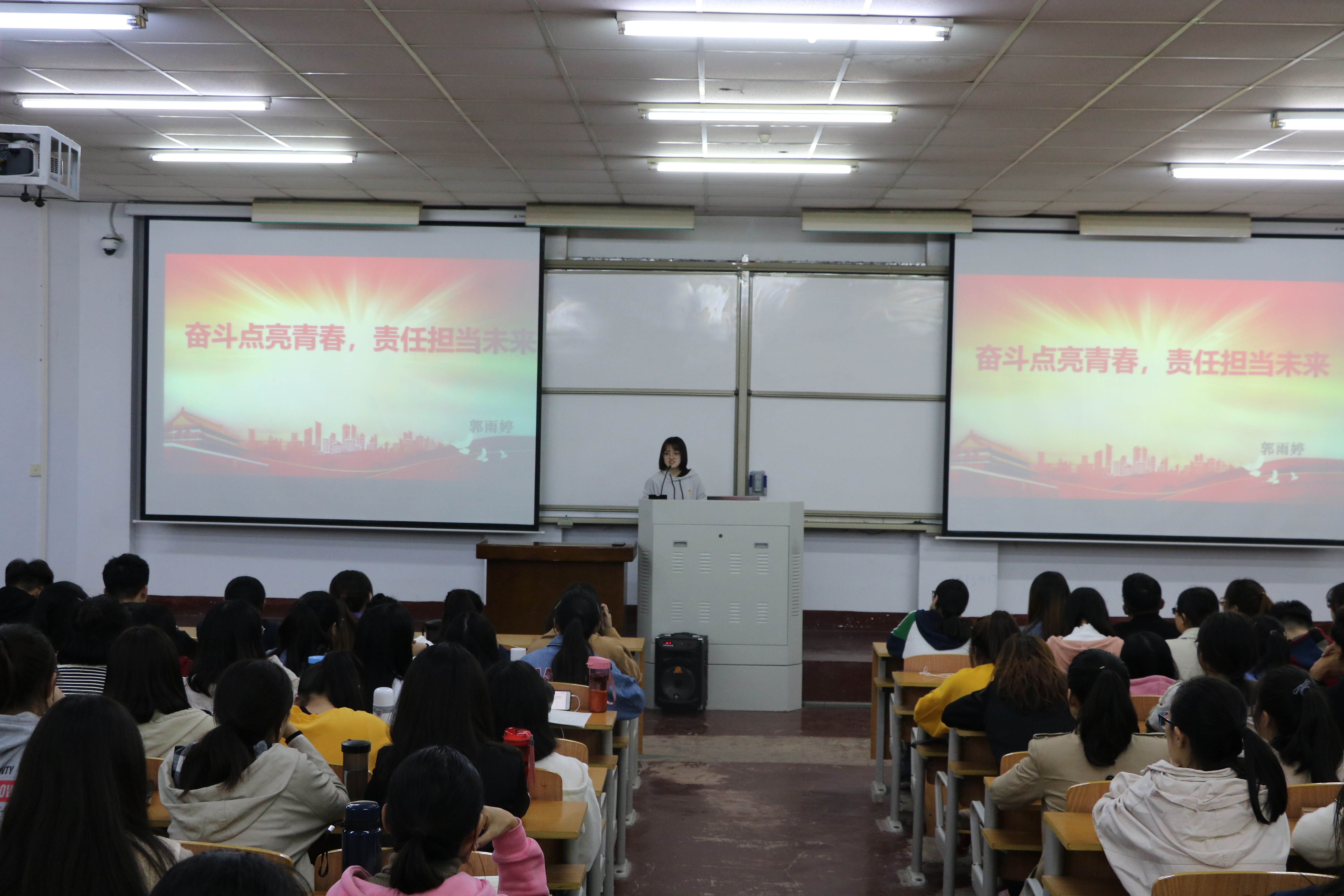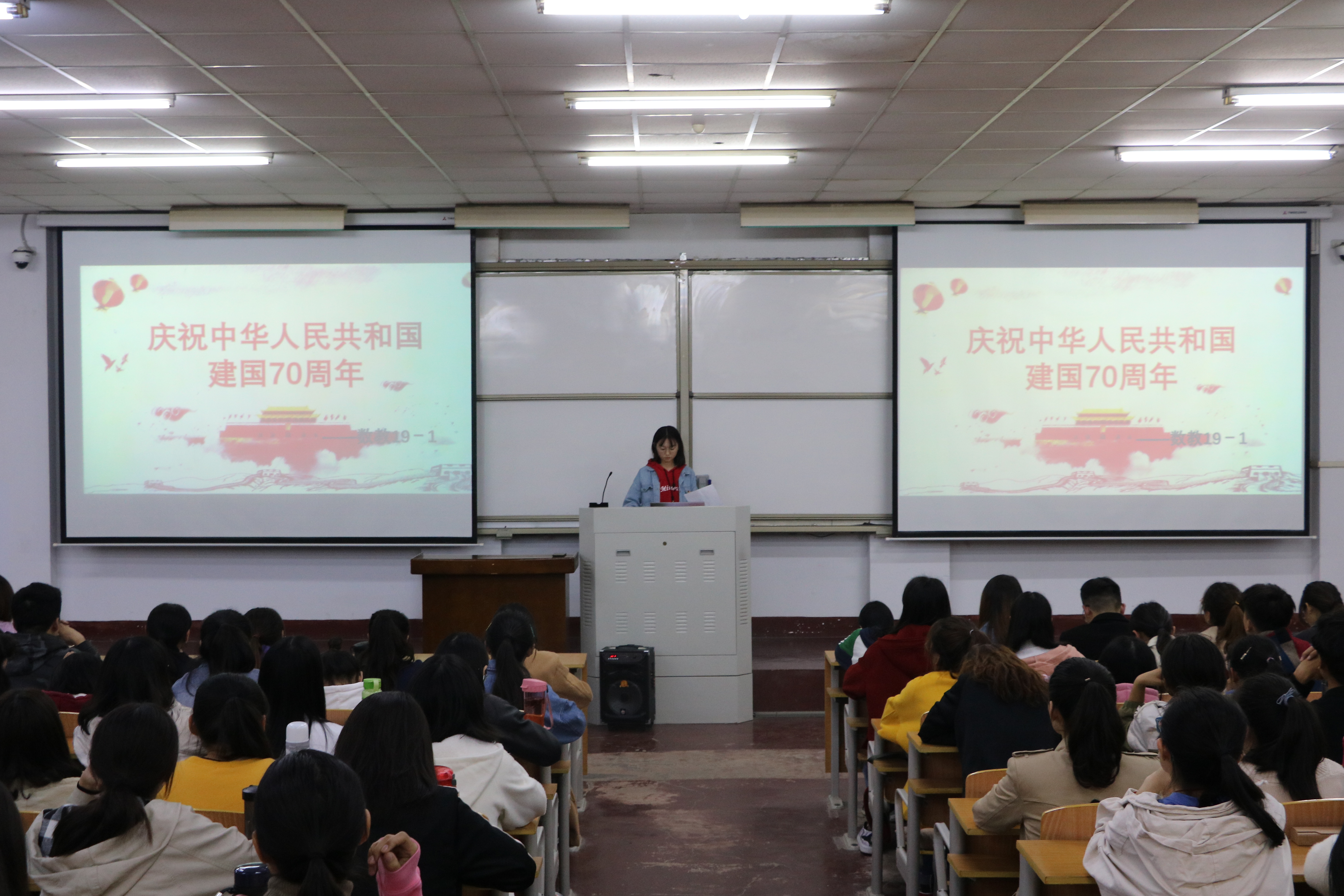 活动开始,五个团支部成员依次上台,围绕庆祝中华人民共和国成立70周年的主题做了精彩热烈的演讲。所有的团课主讲人都积极准备,演讲中不乏充满了对祖国的热爱和感慨,经历太多坎坷的祖国,仍然屹立不倒,飞速发展。对于社会与民族的未来发展,演讲同学深刻指出青年学子要将远大抱负和脚踏实地有机结合,做一个担当,有责任的新青年,也充分展现了青年学子朝气蓬勃的精神状态和家国情怀。青马班的学员也大都受益匪浅,深刻感受到了祖国的变化,更加坚定了自己的目标与方向。