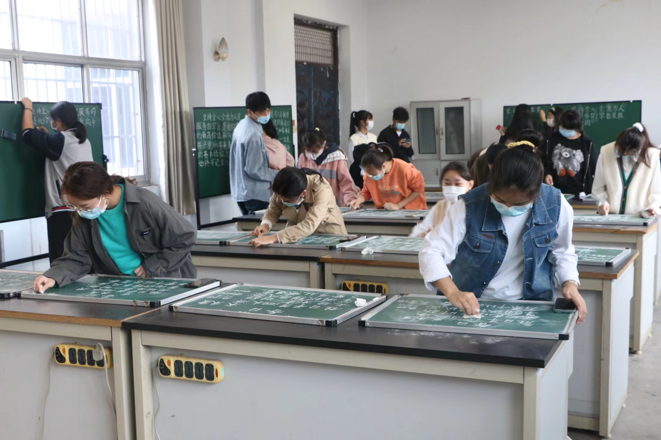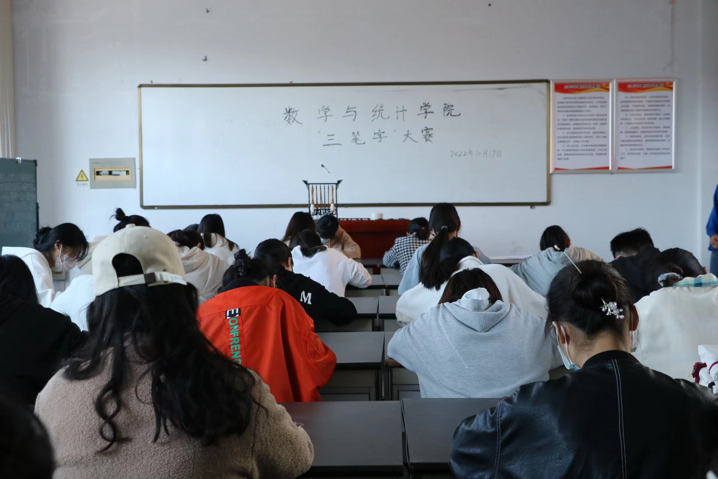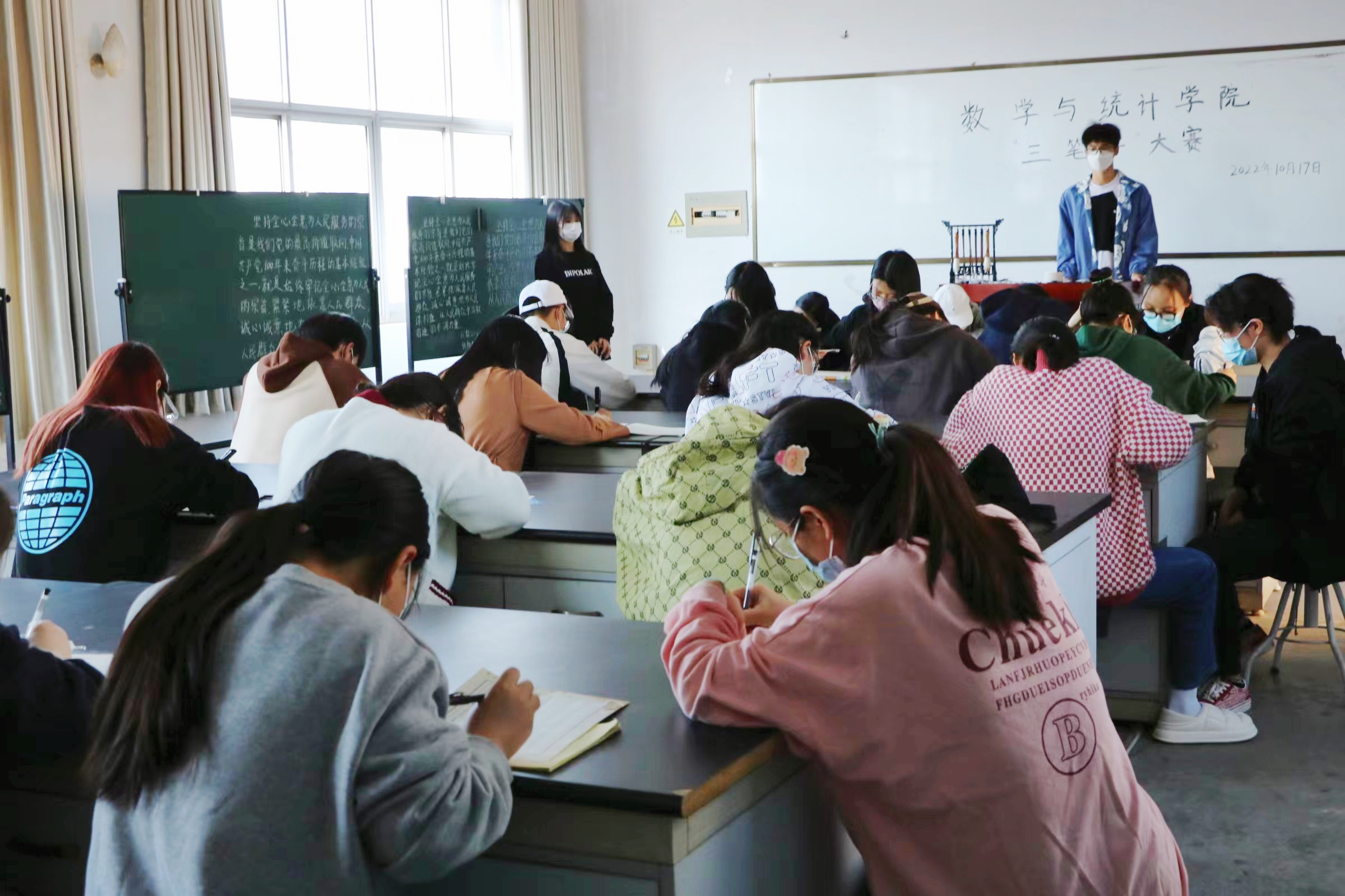 大赛依次进行了粉笔字、钢笔字和毛笔字三个项目。为确保比赛公平、公正地进行,大赛书写材料在比赛开始时公布,所有参赛作品均在现场完成。比赛过程中,参赛选手沉着冷静,挥毫笔墨,用心书写每一个笔画、每一个汉字,展现了良好的书写功底和专业素养,作品笔画流畅,布局协调统一,现场洋溢着笔墨之香。无论是清秀工整的粉笔字,还是苍劲隽美的钢笔字,抑或是遒劲流畅的毛笔字,都在参赛者们的笔下生花。参赛者也在比赛中感受着中国传统书法艺术的博大精深,既陶冶了情操,又平和了心境。