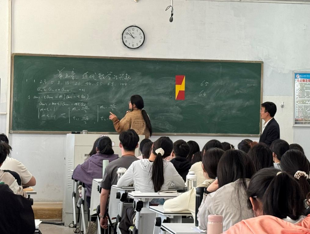 最后根据老师课前布置的推导斐波那契数列的通项公式的任务,员工积极走上讲台展示她的推导过程与结果,程芝轩同学准备充分,巧妙地转化成等比数列推导出斐波那契数列的通项公式。荆天又分别从线性变换和幂级数的角度进行了及时的补充,让同学们可以用多种方法进行推导。从中可以看到荆天老师不仅是对员工进行“传道、授业、解惑”,更是员工学习的组织者、引导者、启发者和合作者。