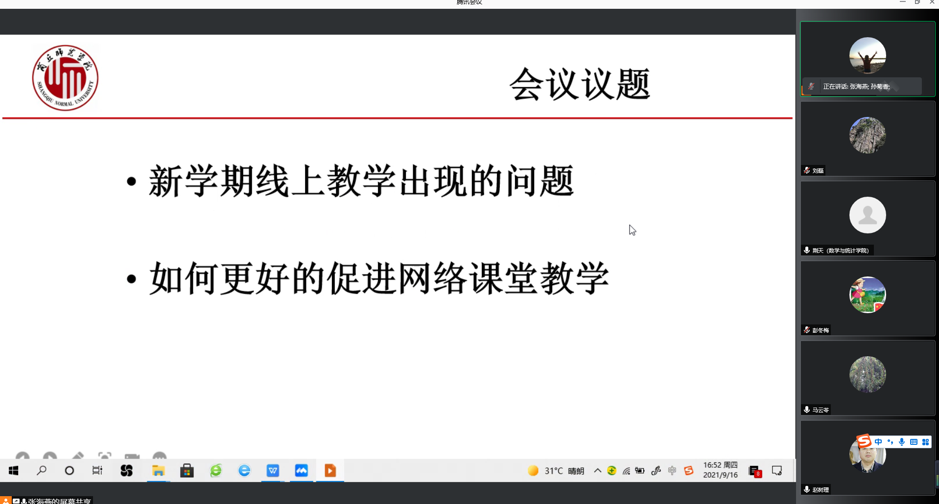 为落实网络教学的各项教学任务,更好的提高线上网络教学的效果,9月16下午,beats365中文官网数学与应用数学系通过腾讯会议召开了教学研讨会,会议由系主任张海燕主持,系全体教师参加。